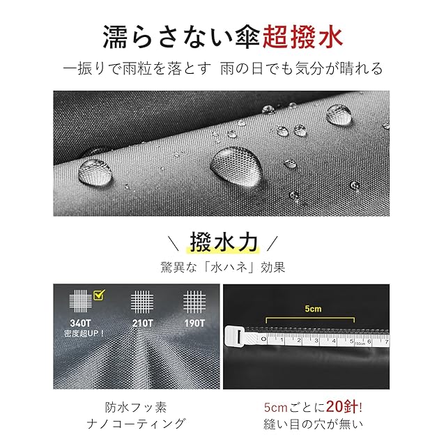 【傘に関する5つの悩みを解決】 フックに引っ掛けやすい三角の取っ手と、収納がしやすい丸キャップを用意しました。 縫い目の穴がなく、雨量の多い雨でも漏水しにくいです。 ハンドルに57ヵ所の飛び出し防止ストッパーを設置し、中棒の飛び出しを防ぎます。 軽くて丈夫なアルミニウム製の親骨を採用し持ち運びにも便利です。 340Tの超高密度傘布、5cmごとに20針を縫い付け、長くご愛用できるように仕上げました。
