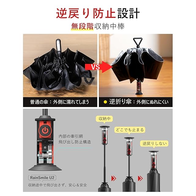 【RainSmile傘の5つの特徴】 逆折り設計で、雨で濡れる面が内側になります。周囲を濡らすようなことはありません。 超撥水ナノコーティングを採用。蓮の葉のように雨水を弾きます。雨の日をより快適に。 飛び出し防止設計で、中棒を段階的に収納が可能です。あなたの安全と安心を守ります。 最高仕様の黒ゴム製生地を使用。手につかずにひび割れず、日傘としては遮光率100%を実現。 紫外線uvカットを99%カットし、実測で傘下の気温を15度下げることができます。晴れの日は日傘としても使えます。