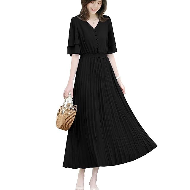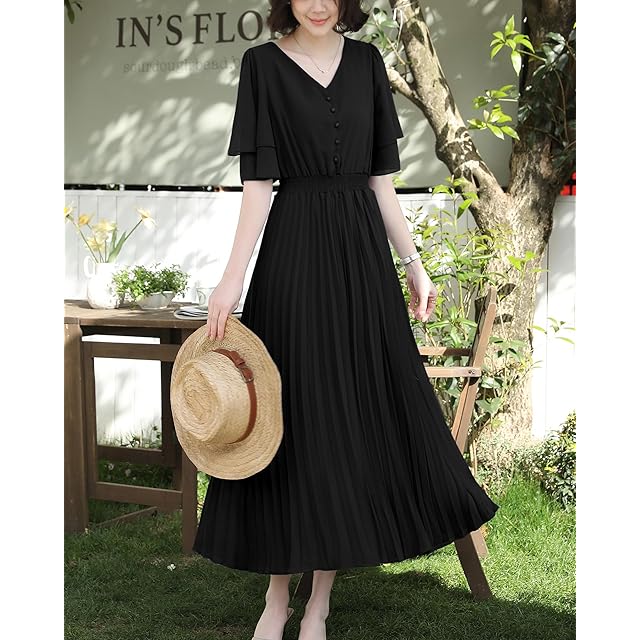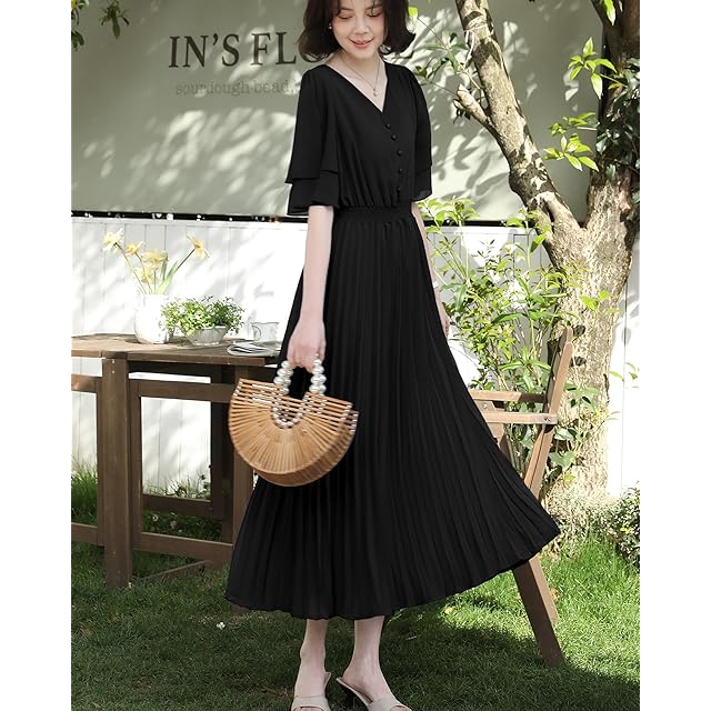 基本情報:素材:ポリエステル。シフォン生地が軽やかで涼しく、蒸し暑い夏でもさらりと着こなせるロングワンピースです。推奨シーズン:4-9月。生地の厚さ:★★☆☆☆;Ⅴネック;袖は二重素材をが施されており;履き心地が良いゴムウエスト;プリーツの裾。胸元のボタンが自由にかけることができます。裏地付きで、ご安心に着用いただけます。ミモレ丈の丈感でお気になるヒップや太ももをしっかりとカバしてくれるのも嬉しいポイントです。