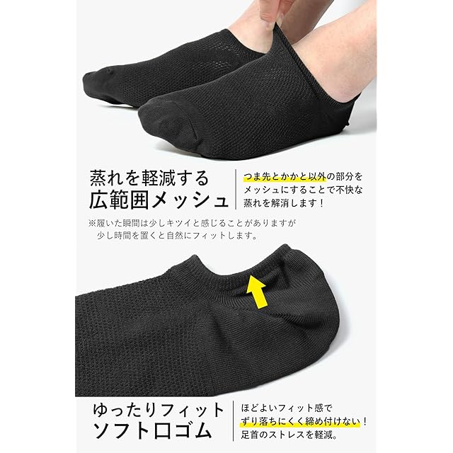 【蒸れを軽減する広範囲メッシュ】 つま先とかかと以外の部分をメッシュにすることで不快な蒸れを軽減します! 【脱げないを追求 立体編み設計】 つま先からかかとまで独自の編み組織(特許)で編み立てることで脱げないを実現しました。 【ゆったりフィット ソフト口ゴム】 ほどよいフィット感でずり落ちにくく締め付けない! 足首のストレスを軽減。 【あらゆる角度に対応 広範囲テープ】 テストを繰り返して生み出した広範囲テープはあらゆる角度からの負荷に対応したグリップ力を実現! 【天然有機系デオドラント加工】 「Lonfresh ロンフレッシュ」を使用 天然由来の原料から生成された抗菌剤を特殊な方法で繊維に結合させ、臭いの原因となる繊維状の常在菌が増殖するのを抑制します。