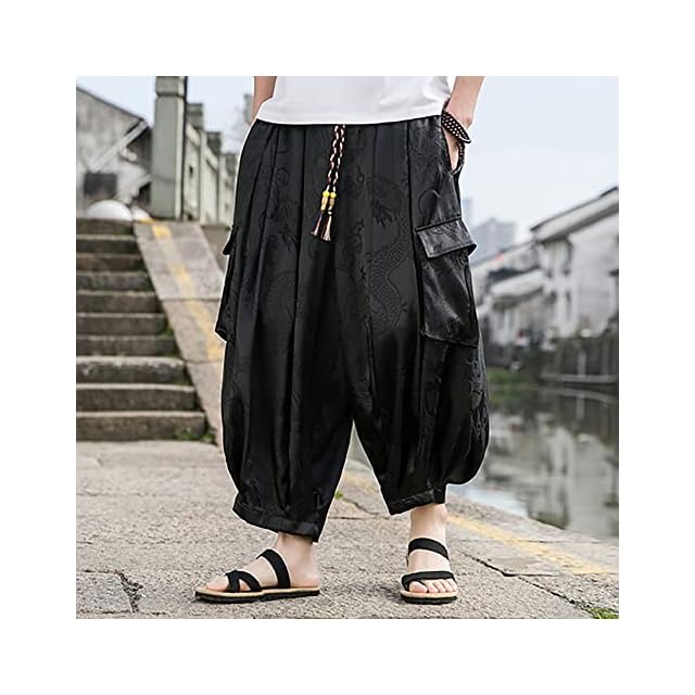 [foveitaa] メンズ 夏服 サルエルパンツ ワイドパンツ 大きいサイズ 和風 エスニック アラジンパンツ ガウチョパンツ ズボン 袴パンツ ボトムス 調整紐 無地 ゆったりパンツ 部屋着 クロップドパンツ ハーフパンツ 九分丈 black L