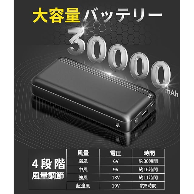 Sumeriy空調作業服は今年いよいよグレードアップして再登場!30000mAhの大容量バッテリー、クイックチャージケーブル付属、最長26時間連続稼働可能、最大出力電圧19Vです。風量、使用寿命は市販のものを圧倒的に上回り、夏バテの悩みを徹底的に解決してくれます。