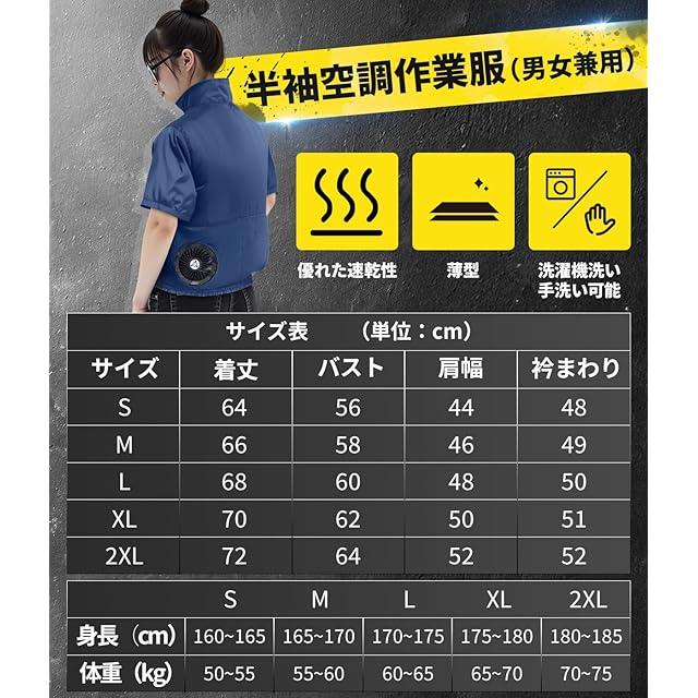 【サイズ選択可・万全のアフターサービス】 ファン付き半袖作業服は5サイズを用意しており、ご購入前にサイズ表をご参考のうえ、身長・体重に合わせてお客様に合ったサイズをお選びください。商品のご使用中に問題やご不明点がございましたら、お気軽にお問い合わせください。迅速に対応させていただきます。