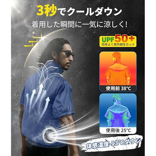 商品名:[Sumeriy] 空調作業服 半袖 30000mAhバッテリー付き 超高出力 超長連続使用時間 ファン付き作業服 4段階風速調節 大風量 ファンバッテリーセット 薄型 吸汗速乾 UVカット 暑さ/熱中症対策 屋外作業 在宅 通勤 男女兼用(XL, ブルー)