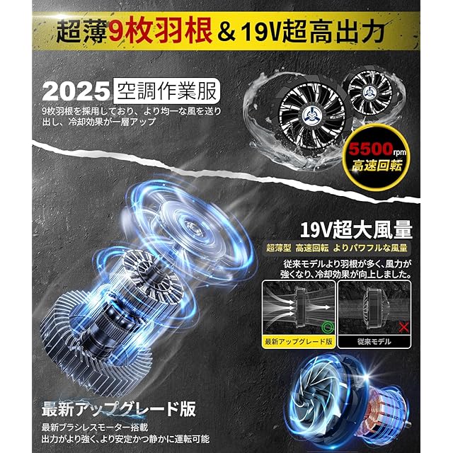 【2025年新登場&ファン付き作業服】 2025年最新モデル19V高出力のファン付き作業服が登場しました。夏の猛暑対策として、左右腰部分に2つのファンが付属しており、服の中に外気を取り入れ、汗の蒸発を促し、より涼しく感じられます。9枚羽根のファンを採用しており、最高出力19Vの出力でパワフルな風を流し、体の熱を奪い、涼しく快適に過ごしていただけます。