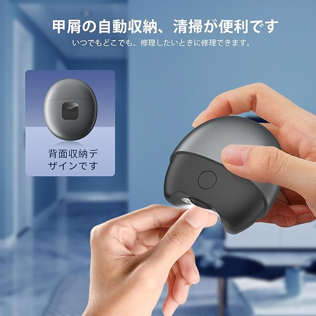 【爪屑の自動保存&操作簡単】自動爪切りにはチップ収納ボックスが内蔵されており、爪をトリミングすると自動的に保存されるので、切った爪の破片が飛び散る心配はありません。片手で簡単に操作することができ、誤操作の心配もありません。使用上の注意: 1同じ部分を長時間処理しないでください。過度な整えが行われて しまう可能性があります。