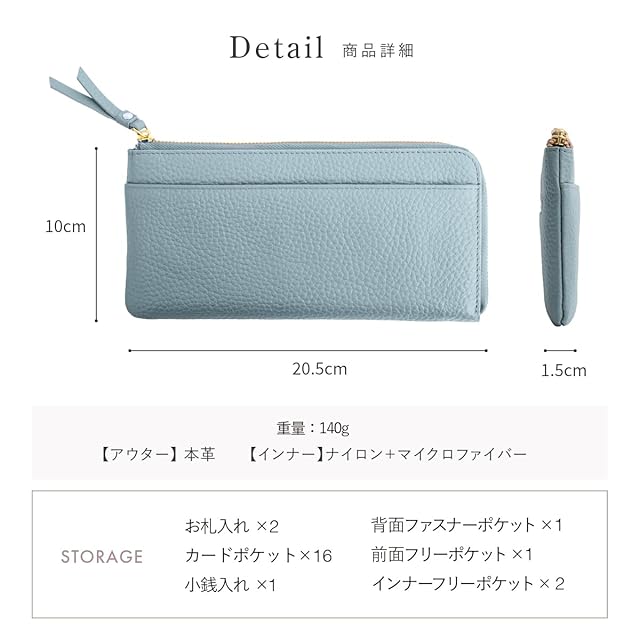 【スペック】・お札入れ × 2・カードポケット × 16・小銭入れ × 1・背面ファスナーポケット × 1・前面フリーポケット × 1・インナーフリーポケット × 2【サイズ】・縦 100mm × 横 205mm × 厚み 15mm ・重さ 140g 【素材】本革 牛革
