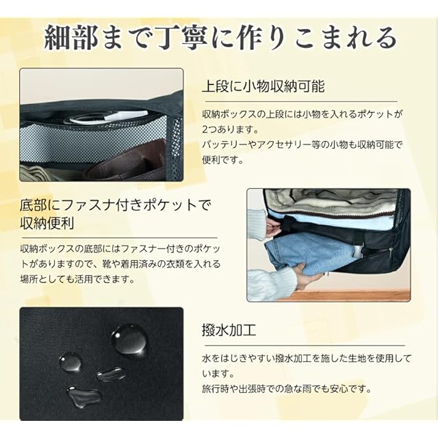 【幅広い適用】旅行用便利アイテムとして位置づけていますが、住居用の収納便利アイテムとしてもかなり優秀です。取り付けも出し入れも簡単で、見た目もシンプルなので、家のクローゼットだけではなく、旅行先のホテル、学生寮、車内やジムなどの場合も有効活用できます。