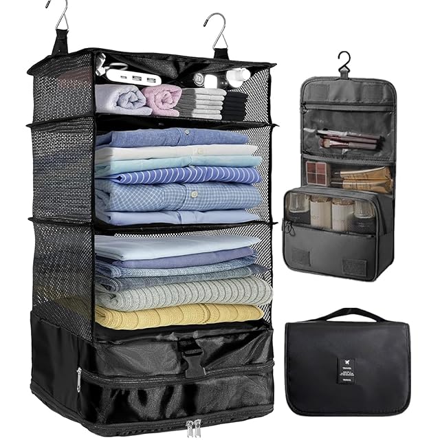 【昇級版】トラベルポーチ 吊り下げ 圧縮 2点セット 旅行 ポーチ 圧縮袋 4段 衣類収納ラック 防水 おしゃれ 取り外し可能 大容量 小さめ 衣類 トラベルポーチ 着替え 大きい 出張 トラベルバッグ インナーバッグ 旅行用圧縮袋 衣装ケース (ブラック, Large)