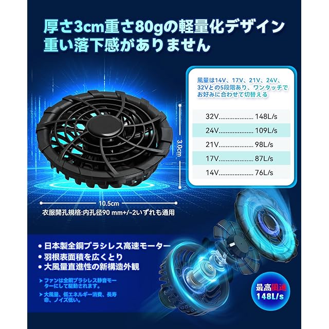 【32V高出力バッテリー】急速充電対応、急速出力対応の2025年最新モデル、32V高出力パワーバッテリー登場!バッテリとファンはDCヘッドを使用して接続され。LED液晶ディスプレイを搭載し、バッテリー残量と出力電圧をリアルタイムかつ正確に表示します。電池が切れるまで安定した風を提供できる。従来のフアン電池残量がなくなると、風が弱くなり、風力調整をしても効かない。シンプルで直観的な操作性です。PSE認証を取得したバッテリー品質と安全性が高い、人体に危害がありません。長期間安心してお使いいただけます。