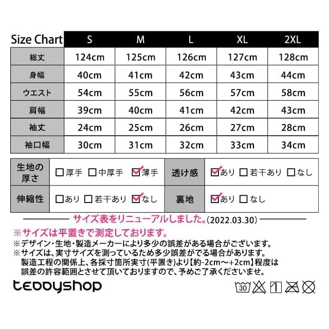 Size M 総丈 125cm 身幅 41cm ウエスト 55cm 肩幅 40cm 袖丈 25cm 袖口幅 31cm