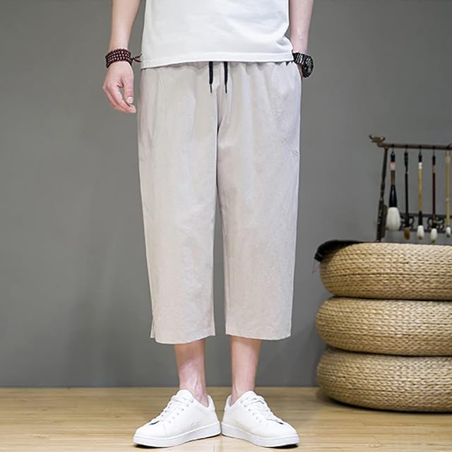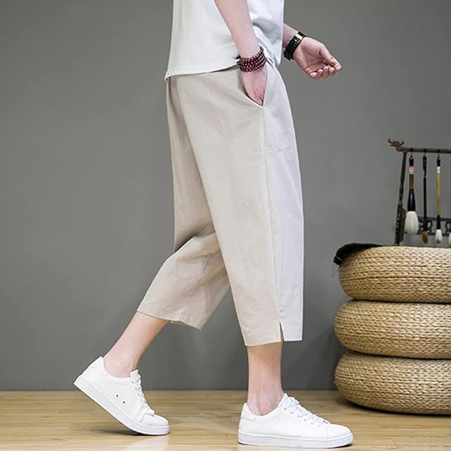 [Platilive] サルエルパンツ ズボン メンズ テーパードパンツ ワイドパンツ 七分丈 綿麻 大きいサイズ ゆったり 調整紐 無地 通気 涼しい カジュアル おしゃれ パンツ ボトムス メンズ 夏服 khaki XL