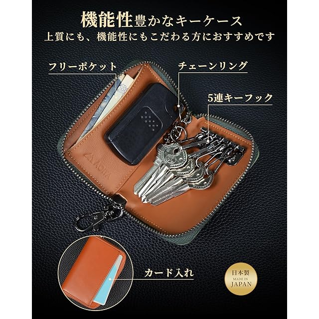 商品名:[Aoita] キーケース メンズ 栃木レザー 日本製 多機能 本革 5連フック YKKファスナー スマートキーケース 車 鍵 コンパクト カード入れ key case プレゼント (グリーン)