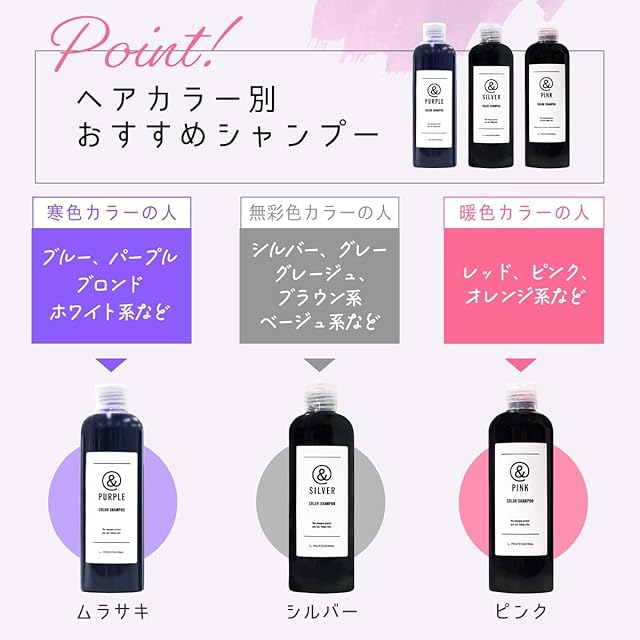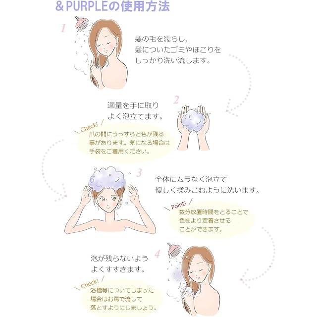 ☆【ご使用上の注意】カラーシャンプーは紫色の色素が含まれています。使用後はお風呂場を丁寧に洗い流してください。