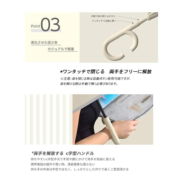 【手離れC型デザイン&両手解放】 C字型の取っ手は開口幅が広く、さまざまな手のサイズに対応。持ち手はカラビナが付いており、ドアや玄関フック、リュック、買い物袋、ベビーカーに簡単に掛けられます。傘を閉じる際はボタン一つで自動的に閉じることができます。買い物中やお子様を抱えている時でも、片手で楽に操作でき、両手が自由になります。※注意:傘を開ける際は手動で開く必要があります。