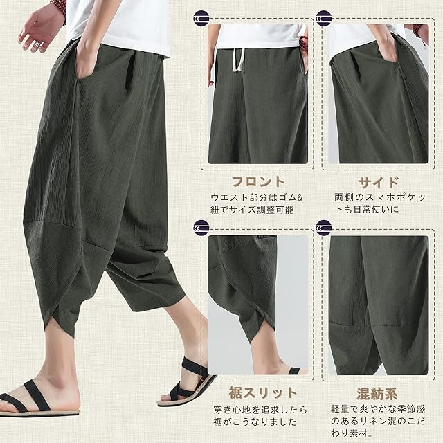 【1】接触冷感・吸汗速乾・ストレッチ性に優れたメンズサルエルパンツが新登場!軽量で爽やかな季節感のあるリネン混のこだわり素材。綿麻特有の通気性で、夏でも快適にサラッと肌あたりがよく涼しげなリネンと、フィットし過ぎないシルエットとサラッとした接触冷感素材の効果で暑い日でも快適な穿き心地です。
