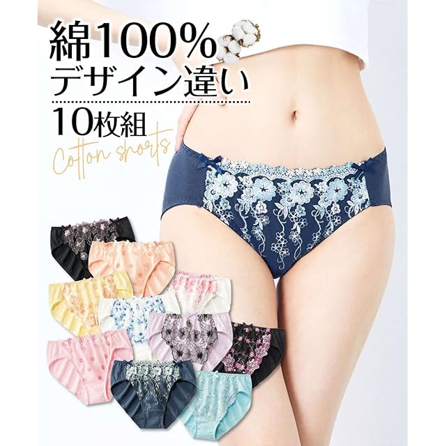 【綿100% デザイン違いの10枚組(レギュラー丈)】フロントに華やかな刺しゅうレースをあしらったエレガントなショーツ。