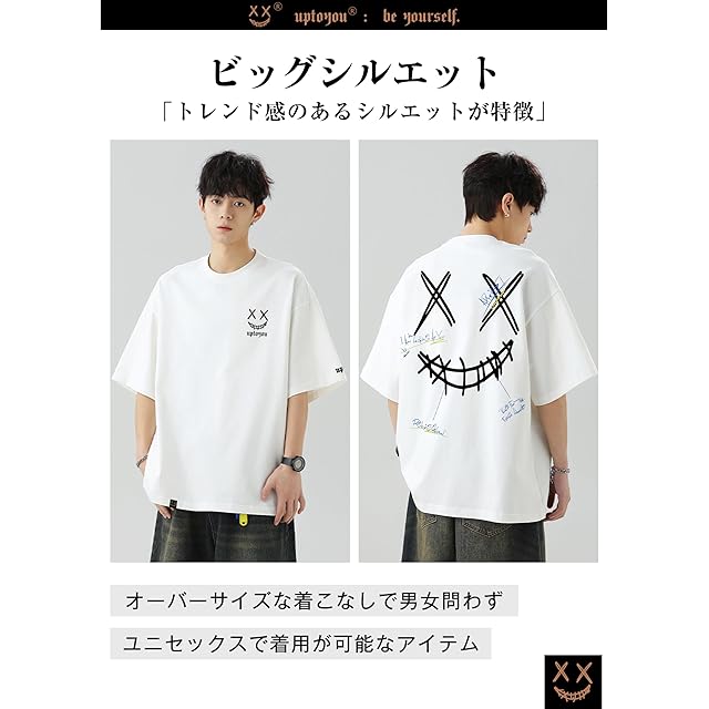 [uptoyou] Tシャツ メンズ 半袖 ビッグシルエット 大きいサイズ ストリート系 透けない 笑顔 バックプリント 吸汗速乾 接触冷感 ヘビーウェイト クルーネック 男女兼用 夏服(S ホワイト)