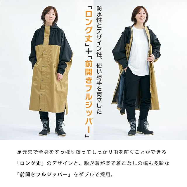ファスナー開閉で前開きできる、ゆったりサイズのレインポンチョ。リュックを背負った状態で着用が可能です。※大きめリュックは着用できない場合があります。