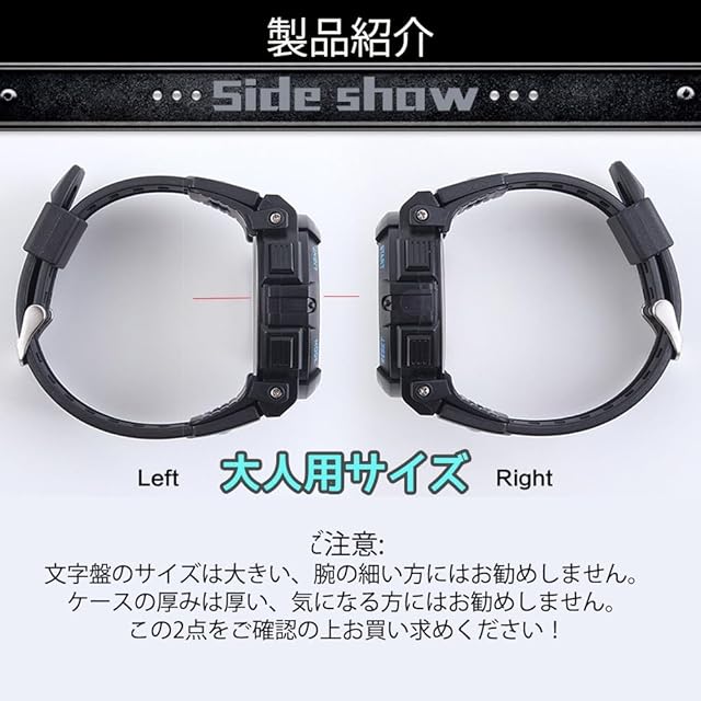 【仕様】ケース直径:約43mm ケース厚み:約15mm バンド長:250mm(約160-230mm調節可能) 本体重さ:約50g 【セット内容】デジタル腕時計+日本語取扱説明書(エコーのため、ボックスなし簡易包装になります。)*月1~2分程度(誤差許容範囲)