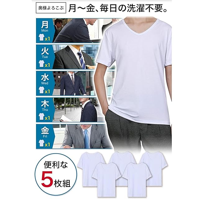 [NCFBAG] インナーシャツ メンズ Tシャツ 半袖 吸水速乾 5枚組 肌着 無地 Vネック 防菌防臭 クセになる肌触り 対応 服 (XXL(170cm~175cm), ホワイト)