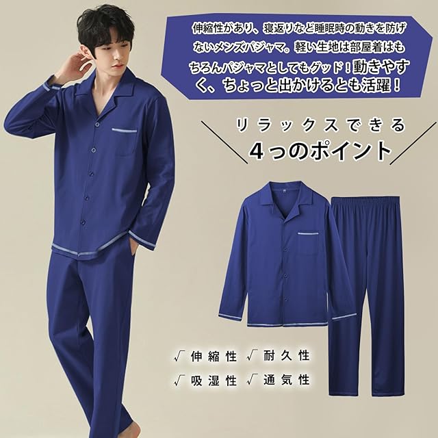[Bellislove] パジャマ メンズ ルームウェア 綿 長袖 薄手 前開き 上下セット ゆったり 春 夏 秋 吸汗 通気 快適 シンプル 肌に優しい 柔らか 軽量 入院着 部屋着 寝間着