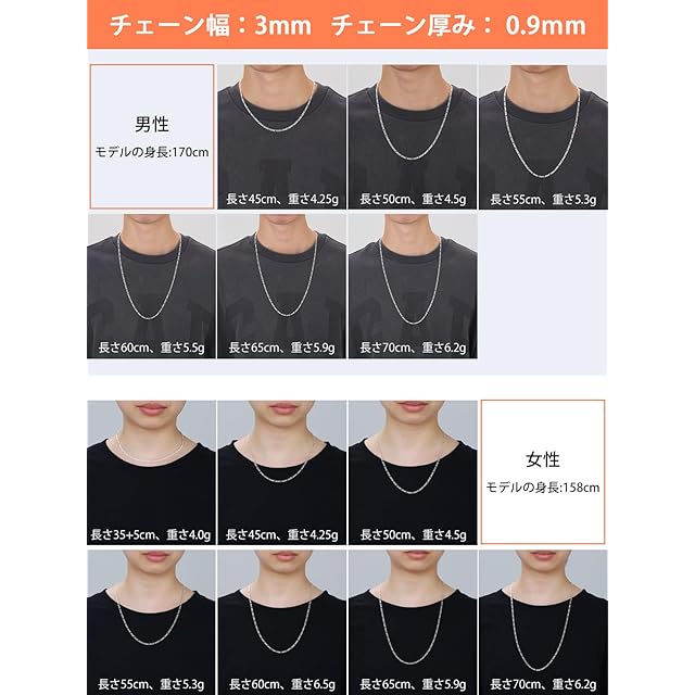 [チェーンネックレス] ネックレスチェーンの幅は約3mmと5mmがあり、チェーンの長さは長さは40cm(35cm+5cm)、45cm、50cm、55cm、60cm、65cm、70cmの7種類をお選びいただけます。