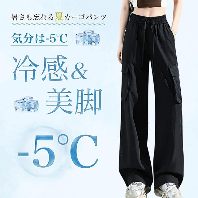 [Kayiyasu] カーゴパンツ レディース ワイドパンツ トレッキングパンツ 夏 接触冷感 速乾 ストレッチ スポーツウェア 大きいサイズ 薄手 日焼け止め UVカット ポケット付き ゴムウエスト 登山 秋(M, ブラック)