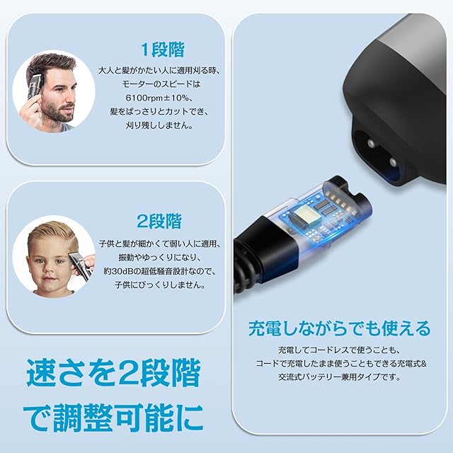 【切れ味抜群‣肌を傷つけない】強力モーターを採用し、革新的な動力調節システムによりパワー不足の問題を解決し、切れ味抜群。刃はチタン合金製とセラミック製の二重構造で、錆びることなく、安全安心なR面取り刃デザイン、お子様の繊細な肌に傷つかない。刃は自動研磨システムで、切れ味が長持ち、髪をひっかかずにスムーズにヘアカットできる。うぶ毛もきれいにカットでき、髪の毛の量が多い方にも快適で便利に使える。※耳や肌に凹凸がある部分(コブ、傷、できものなど)に直接刃を当てない。ご注意 :刃の部分に 1滴ずつさして、刃が更に滑らかでシャープになります。