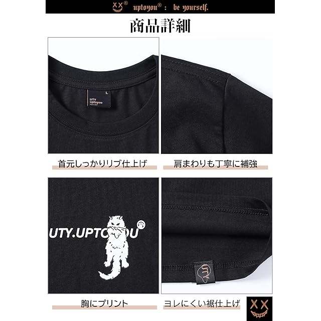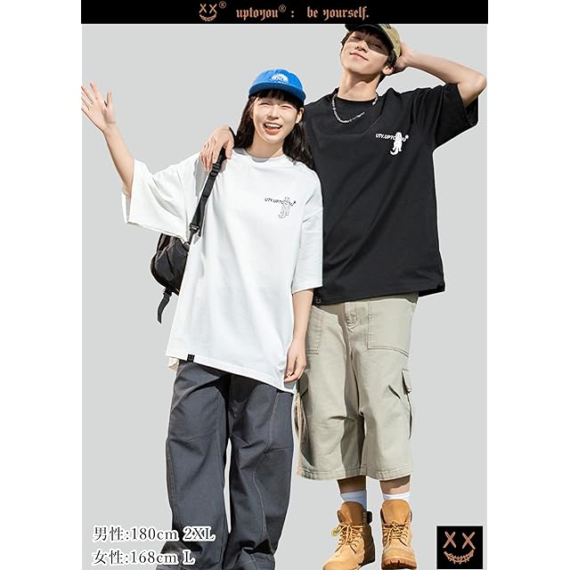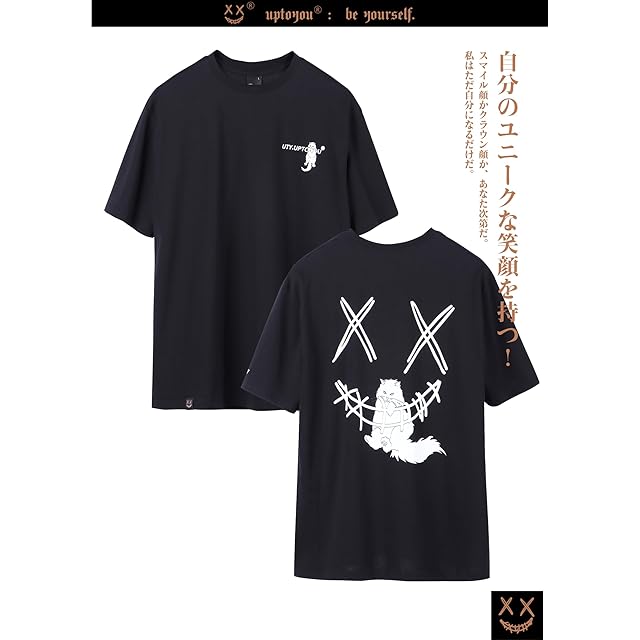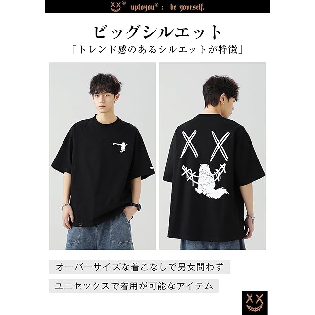 [uptoyou] Tシャツ メンズ 半袖 ビッグシルエット 大きいサイズ ストリート系 透けない 笑顔 バックプリント 吸汗速乾 接触冷感 ヘビーウェイト クルーネック 男女兼用 夏服(S 柄2:ブラック)