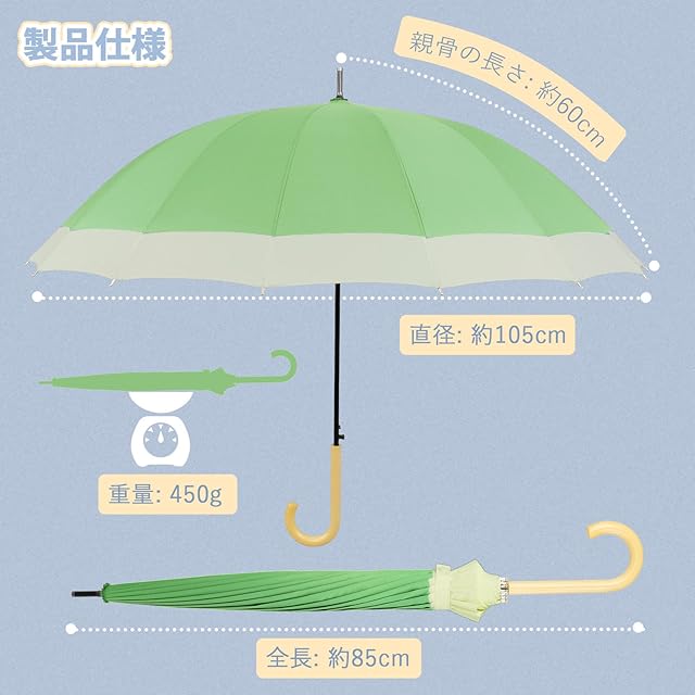 ☔ 【耐久性に優れ、曲線が美しい16本骨傘】その美しい16本の骨は柔軟で丈夫なグラスファイバーを採用し従来の8本骨の2倍の16本骨にすることで今までにない強度と耐久性を実現。強風にあおられても、安易に折れたり曲がったりする心配ありません。雨と風が同時に襲ってきやすい日本だからこそ、丈夫で折れにくい傘は魅力です。風をうまく受け流しながら、悪天候に負けずに使用できます。また、16本骨傘は8本骨傘に比べて円形に近い形状になるので見た目も美しく、男女問わず使用できる傘です。