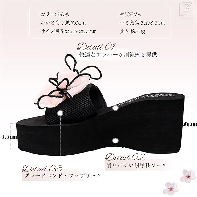 【デザイン】リボンのデザインが甘くて可愛い。7cmのウェッジソールは、身長を伸ばすことができる。厚底設計にもかかわらず、靴全体が超軽量なので、長時間歩いても足が疲れる心配がありません。厚底ソールで美脚脚長効果を実現、履きやすく歩きやすい万能サンダルです。どんな服装にも合わせやすいスリッパ。