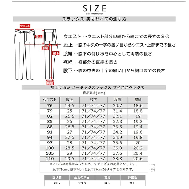 【カラー・取扱サイズ】カラー:【1】ブラック (1071-1/1072-1/1073-1)【2】ネイビー (1071-2/1072-2/1073-2)【3】チャコール (1071-3/1072-3/1073-3)【4】グレー (1071-4/1072-4/1073-4) 【5】ベージュ (1071-5/1072-5/1073-5) サイズ:◆ウエスト:76cm 79cm 82cm 85cm 88cm 91cm 94cm 97cm 100cm 105cm 110cm ◆股下サイズ:股下71cm / 股下74cm/ 股下77cm
