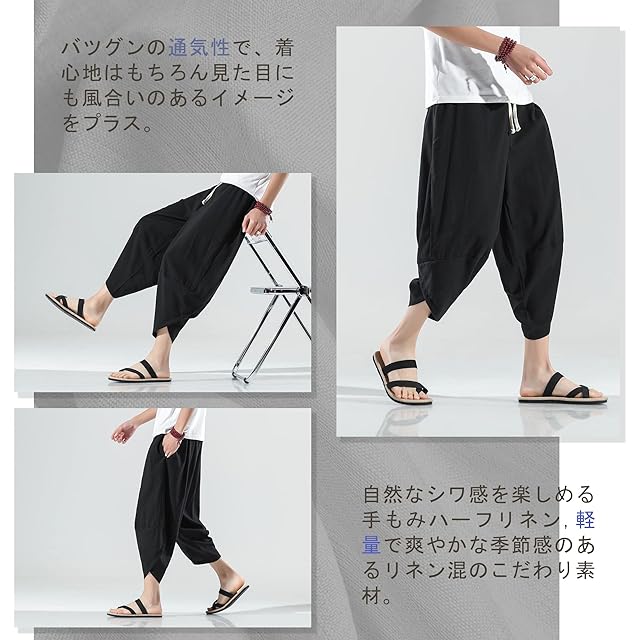 [HMT] サルエルパンツ メンズ ワイドパンツ 7分丈 ズボン 夏服 アラジンパンツ ゆったり ボトムス 涼しい 綿麻シャンブレー ずぼん イージー ぱんつ リネンパンツ エスニック 袴パンツ 春 夏