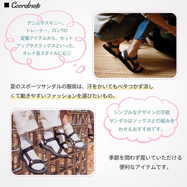 「どんなシーンにも溶け込む高いデザイン力」ぺたんこのスポサンでありながら、多様なスタイルとマッチするコンフォートサンダル。デニムなどのカジュアル系はもちろん、スカートやワンピースのフェミニンアイテムに合わせればスポーツミックススタイルが完。シンプルなデザインの万能サンダルはソックスとの組み合わせもおすすめです。ベーシックなカラーから鮮やかなカラーまで展開されているので、お気に入りのカラーを見つけてみてください。
