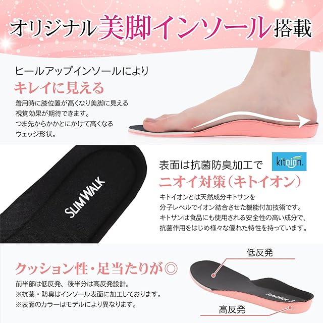 【オリジナル美脚インソール搭載】 ヒールアップインソールによりスッキリ見え、着用時に膝位置が高くなり美脚に見える視覚効果が期待できます つま先からかかとにかけて高くなるウェッジ形状です