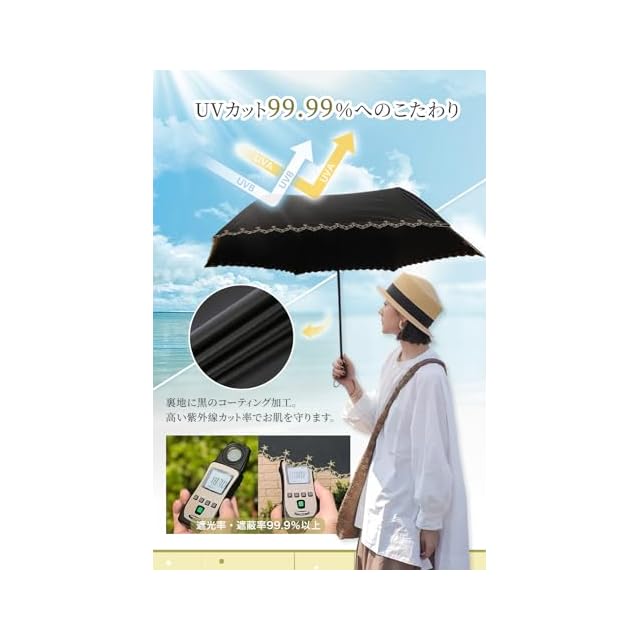 「UVカット&完全遮光」裏地に黒のコーティング加工を施し、遮光率100%、紫外線遮蔽率99.99%以上の遮光日傘です。有害紫外線や日差しからお肌を守り、日焼け防止、暑い夏の熱中症対策にも役立ちます。