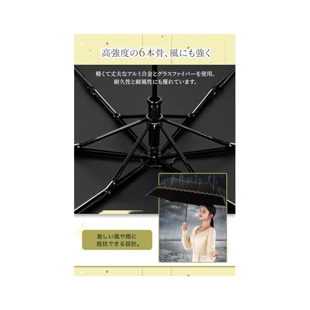 「高強度の6本骨&耐風」軽くて丈夫なアルミ合金とグラスファイバーを使用する傘骨が6本あるので、優れた耐風性を持っています。強い風にあおられても折れたり曲がったりしにくいし、万が一逆さに反しても傘を閉じる動作で簡単に元戻ります。豪雨、強風など不安定な天気の日でもでも安心できます。