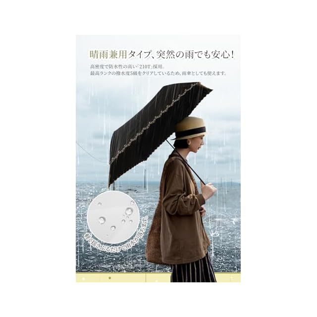 「晴雨兼用&超撥水加工」傘布は高密度で防水性の高い「210T」を採用し、表面は防水加工を施しており、撥水性が優れています。軽く振るだけで雨水を振り払うことができる。電車内など公共の場でも迷惑になりません。最高クラスの撥水度5級を取得し、 雨傘としても使えます。