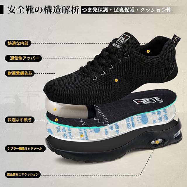 [nieion] 安全靴 作業靴 メンズ レディース エアクッション 安全スニ一カ一 鋼先芯 釘踏み抜き防止 軽量 耐滑 耐摩耗 衝撃吸収 工事現場 ワークシューズ セーフティーシューズ あんぜん靴 (ブラック 23.0cm)