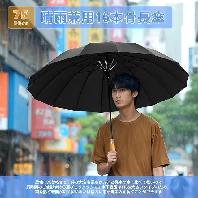 【耐久性に優れ、曲線が美しい16本骨傘】その美しい16本の骨は柔軟で丈夫なグラスファイバーを採用し従来の8本骨の2倍の16本骨にすることで今までにない強度と耐久性を実現。強風にあおられても、安易に折れたり曲がったりする心配ありません。雨と風が同時に襲ってきやすい日本だからこそ、丈夫で折れにくい傘は魅力です。風をうまく受け流しながら、悪天候に負けずに使用できます。また、16本骨傘は8本骨傘に比べて円形に近い形状になるので見た目も美しく、男女問わず使用できる傘です。