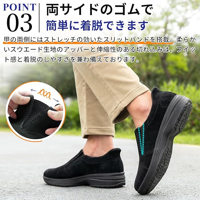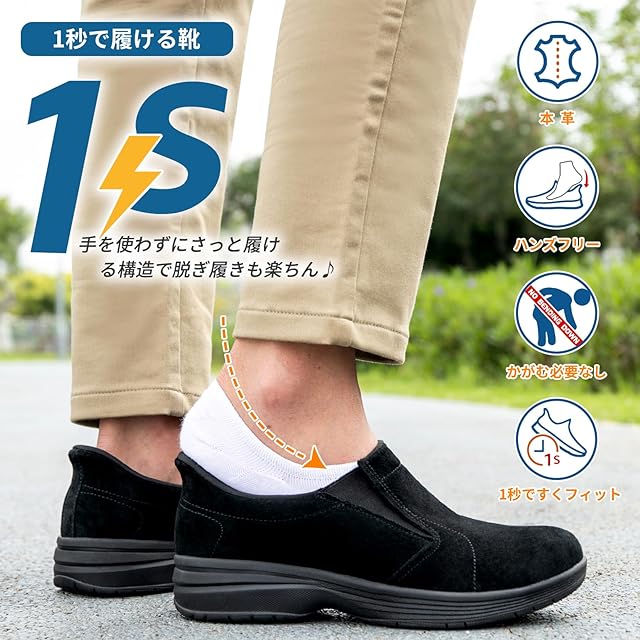 [MERPHINE] 【立ったまま履ける】本革 スエード スリッポン スニーカー メンズ スリップイン 手を使わずに履ける ウォーキングシューズ 紐なし カジュアル 履きやすい 夏 キャンプ 通勤 ドライビング ブラック