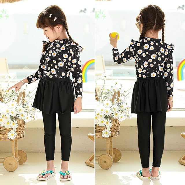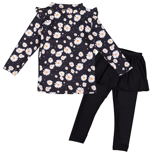 [Teddy] 水着 キッズ 女の子 セパレート 長袖ラッシュガード スカート付きレギンス 上下セット kids421 (130cm, ブラック×フラワー)