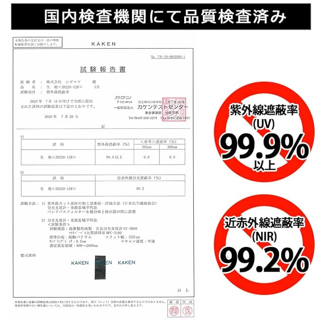 紫外線遮蔽率(UVカット):99.9%以上、近赤外線遮蔽率:99.2%、遮熱率:65%以上、体感温度:-10℃以上