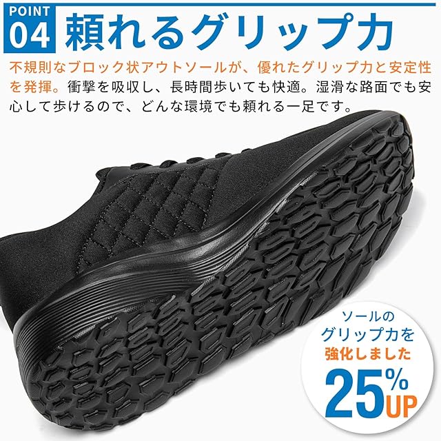 【立ったまま簡単に履けるデザイン】忙しい朝でも、靴べらなしで立ったままで簡単に履けるデザイン。靴紐やバンドの調整も不要で、準備時間を大幅に短縮できます。家事や育児に忙しい方や、通勤を急ぐビジネスマンに最適。朝の時間を有効に使える、便利でスムーズな履き心地を提供します。お客様には、普段お履きのス二一カ一より0.5センチ大きいサイズのご購入をお勧めいたします。