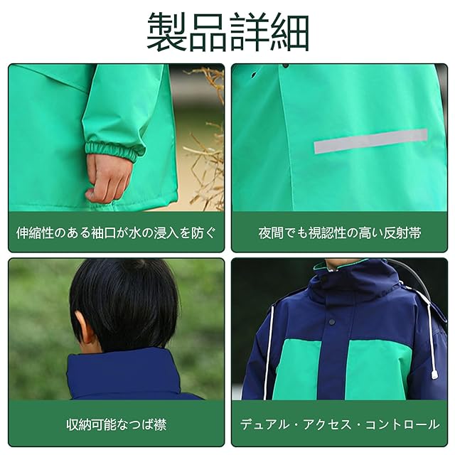 【安全な【ランドセル対応】背部のランドセルを入れるスペースがあり、リュックやランドセルを背負ったまま、レインコートが着れます。普段使いはボタンで折りたたむことができるので、ランドセルやリュックを背負う場合はスナップボタンを外してとめておけばゆったりと着られます。デザイン】レインコートは反射テープが付き、薄暗い雨の日でも、車のライトに反射して光るので安心。日中や暗い所で雨天に歩行、自転車、夜間運動をする際により安全になっています。また、透明で大きなバイザーは、顔や目を雨から効果的に遮ることができます。