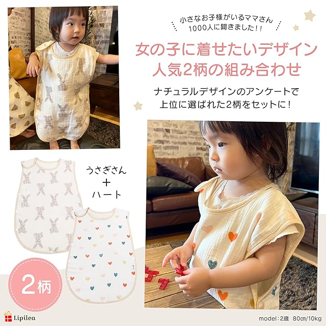[Lipilea] リピレア スリーパー 赤ちゃん 4重ガーゼ 綿 100% 女の子 男の子 出産祝い 新生児 3~7歳 (1.ハート&うさぎ【2枚セット】 キッズ