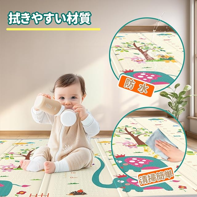 「滑り止め・防水・防汚効果」:マットの表面にこまやかなエンボス加工を施しています。子供が走っても滑りにくいので安心です。防水・防汚加工が施されており、汚れた場合は濡れた布でベビーマット表面の液体や汚れなどサッと拭き取れ、お手入れ簡単です!