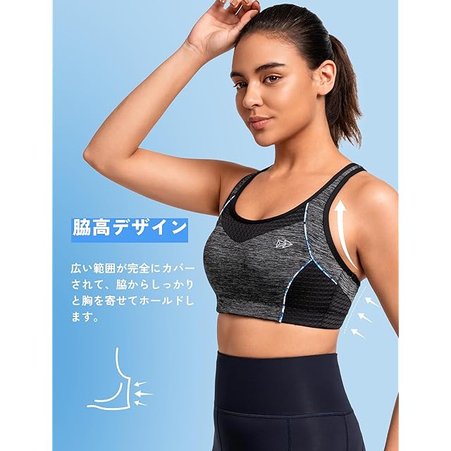 ランニング——ハイインパクト、4WAYストレッチ素材を使い、ホールド力が高くぴったりとフィット。胸が大きい方にランニングの時も揺れを防いで、胸筋辺りが痛くない