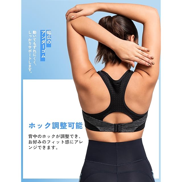 フィットネス——背中の三段階あるホック付き、汗をかいても脱ぎやすく、アンダーの調整によってきちんと支えます。フロントのカバー面積が広いので谷間が見えなくて胸元が気になりません